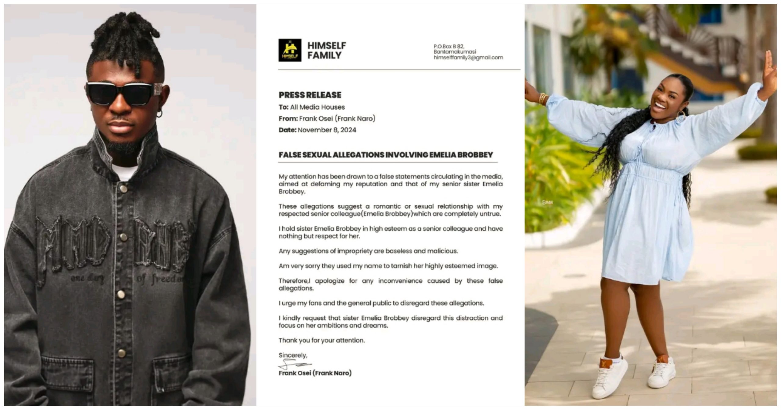 Ghanaian actor and artiste Frank Naro has addressed swirling rumors surrounding his relationship with colleague Emelia Brobbey.